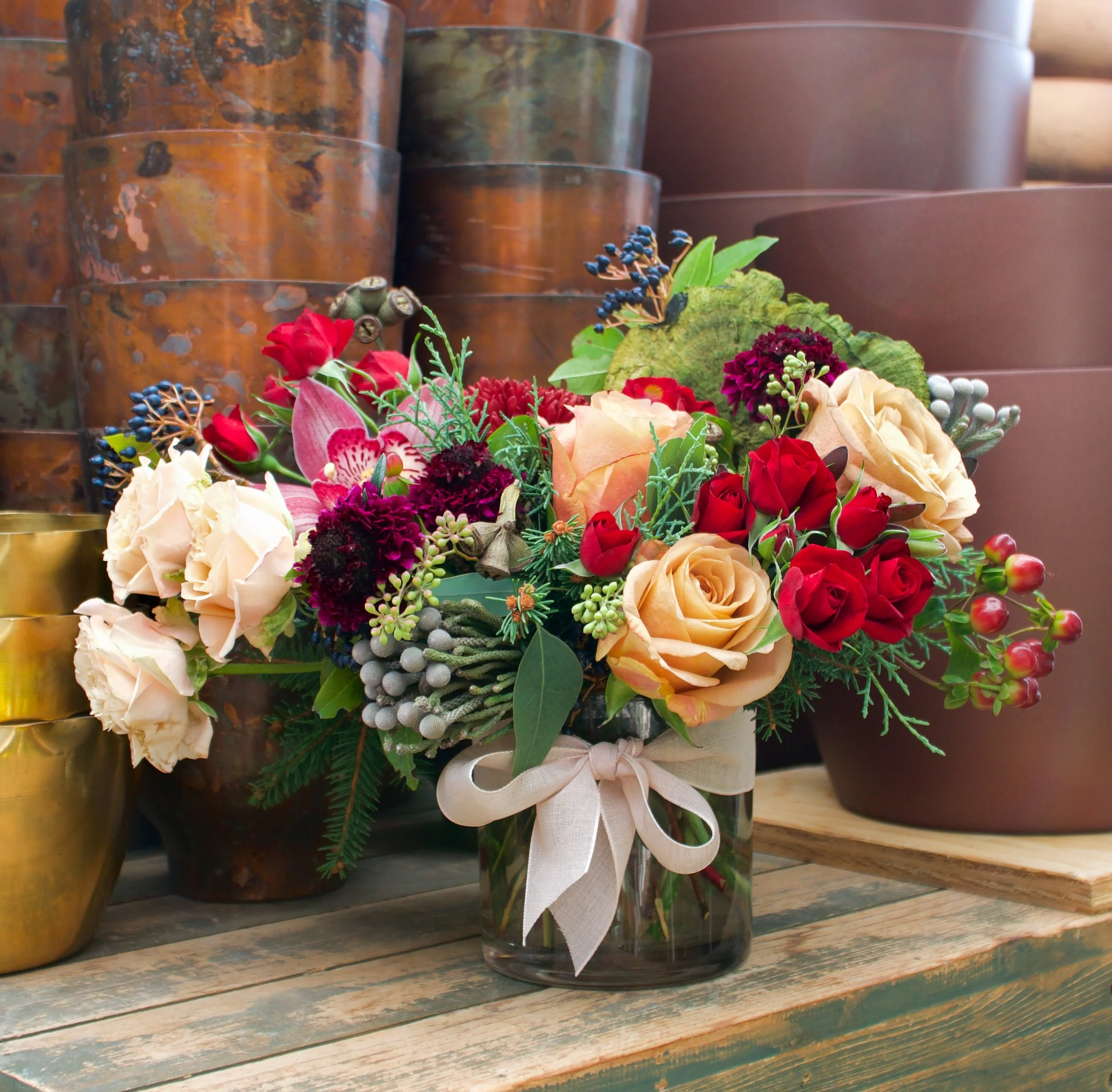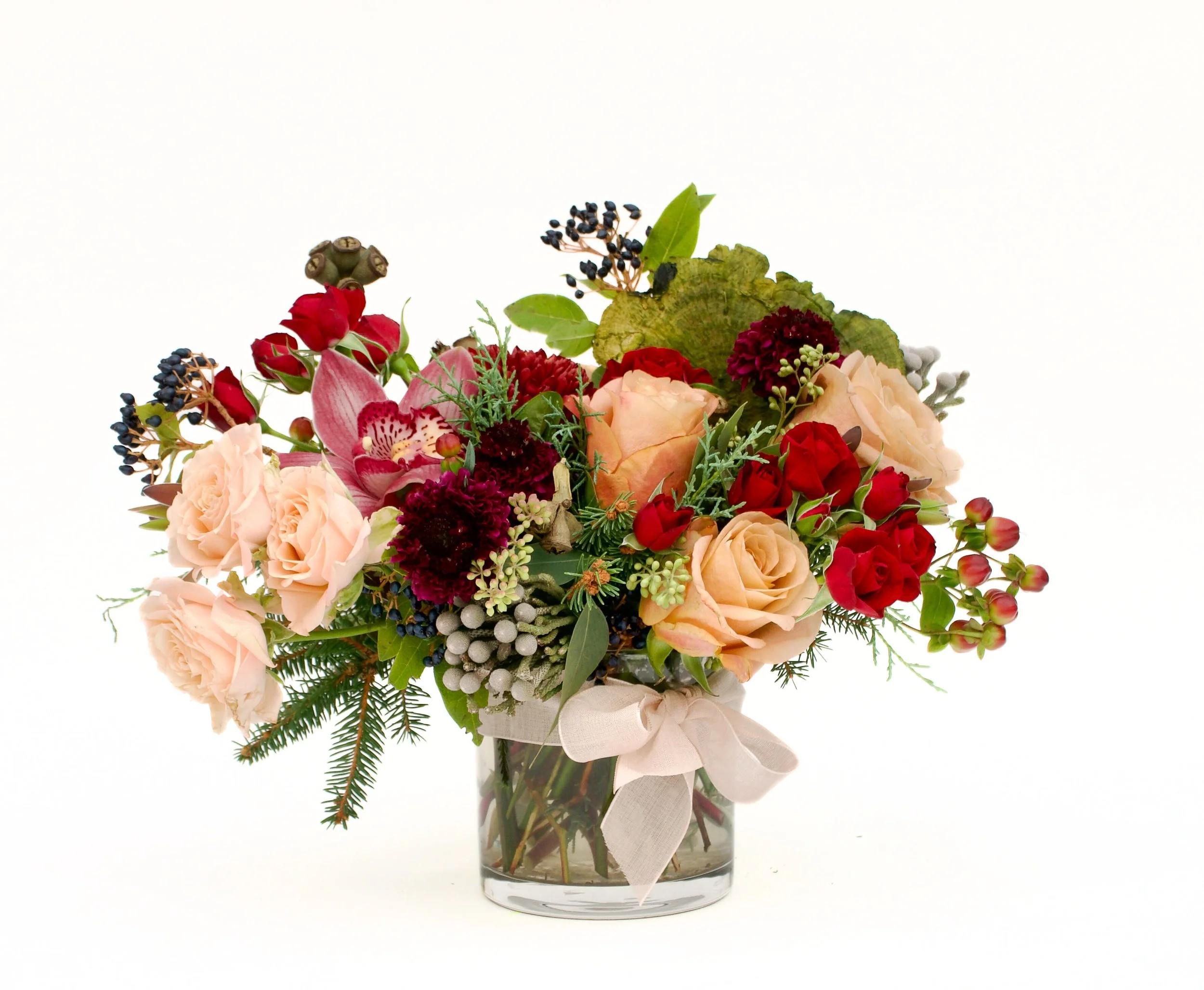 This holiday floral arrangement features an abundance of rich berries and deep-colored blooms, creating a lush and vibrant display. The bold, jewel-toned flowers paired with clusters of berries evoke a sense of festive elegance and warmth.