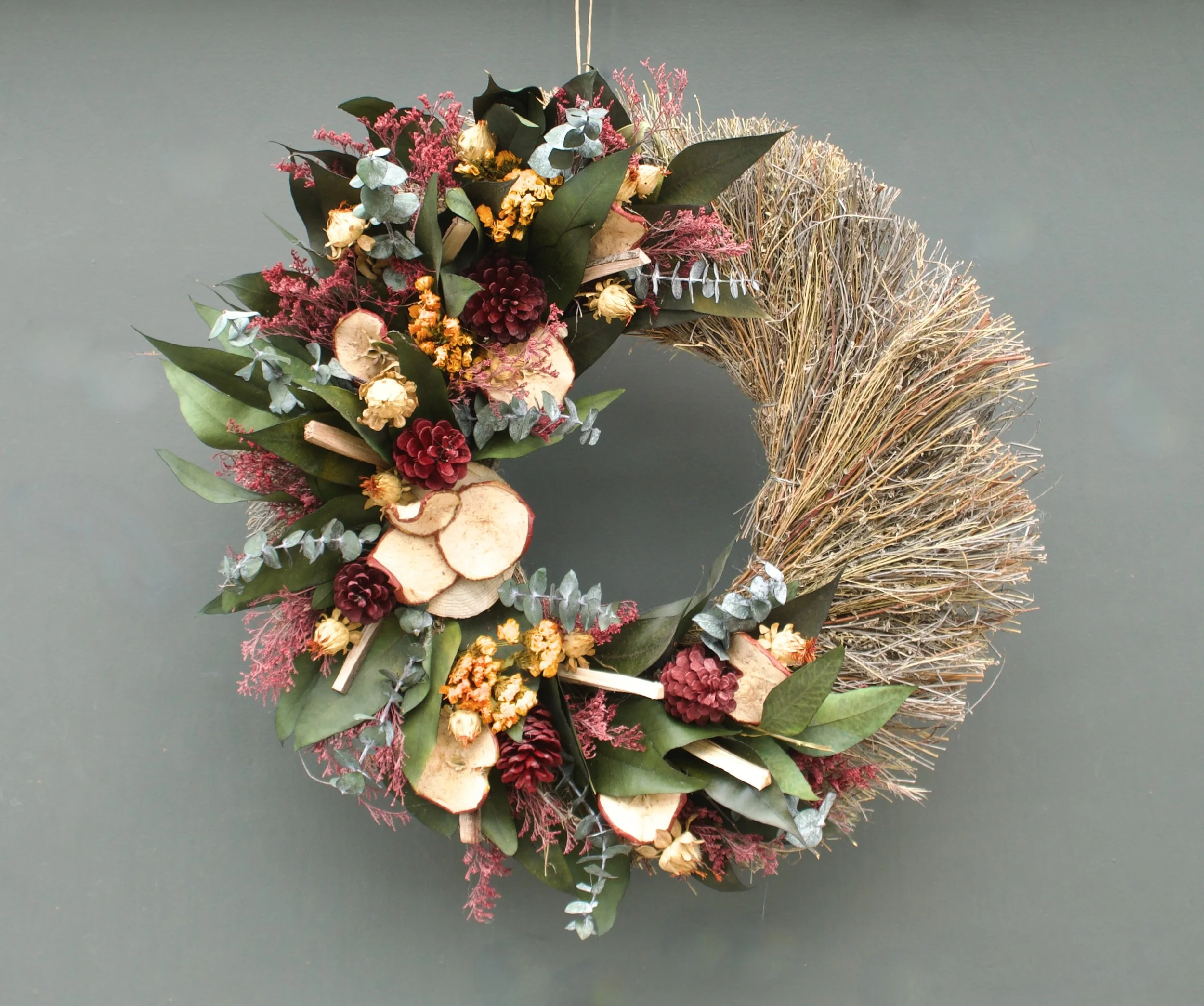 Embrace the warmth of autumn with this charming fall wreath. Adorned with rustic pinecones, dried apples, and fragrant eucalyptus, it captures the essence of the season’s natural beauty.